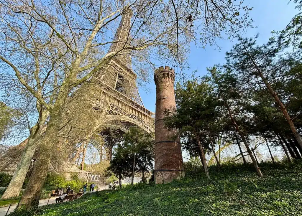 Sans panneau explicatif, sans indication particulière, cette cheminée en briques rouges d’une douzaine de mètres de haut passe presque inaperçue… Située dans le jardin entre les piliers sud et ouest, côté quai Branly, elle est plus facile à repérer en hiver ou au début du printemps, lorsque la végétation est moins dense. En s’approchant, on remarque alors ses briques encore bien conservées et son couronnement décoratif en arcatures, qui lui donnent des airs de petite tour médiévale. Certains observateurs pensent même distinguer l’emplacement d’une ancienne ouverture désormais murée, attisant encore plus la curiosité !